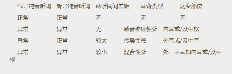 純音聽力檢查結果體現為純音聽力圖。</p><p> 正常情況下我們是通過兩條途徑來感受聲音信號的——氣導途徑和骨導途徑。前者我們非常熟悉,從外耳到中耳到內耳到聽中樞;后者我們或許不太注意:從顱骨直接到內耳到聽中樞。相應地,純音聽力檢查也有兩種聲音剌激方式,氣導輸入和骨導輸入。前者我們天天使用,而后者則很少被我們使用。事實上,兩閾值曲線的異同正是我們判斷聽損病變部位的基礎(見下表)。了解患者病變部位對于獲得他們的信任以及確定助聽器電聲性能都有非同尋常的意義。因此,有條件的時候還是應當重視骨導聽閾測試。</p><p style="text-align: center;"><img src="/upfiles/201906100237368907.png" alt="" /><br /></p><p> 更多詳情請登錄聽覺有道助聽器m.xhfkj.cn</p>" />