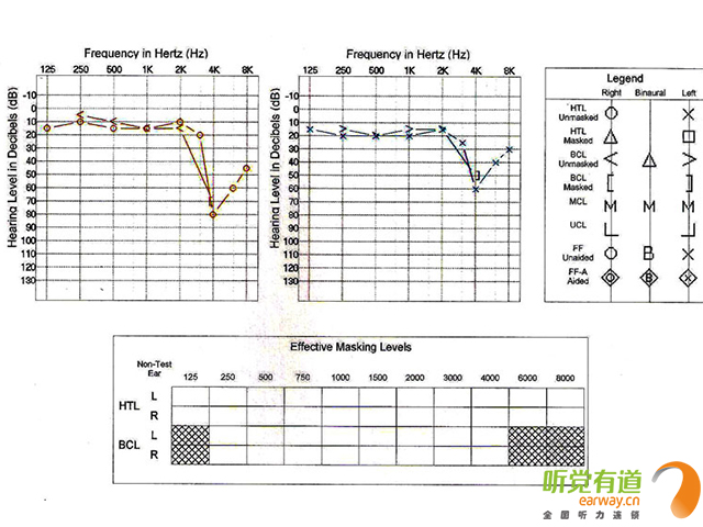 接著說一下聽力圖上的圈圈叉叉代表的意思。叉叉表示左耳的氣導聽閾,圈圈表示右耳氣導,開口向左的尖括號表示左耳骨導,開口向右的表示右耳骨導。旁邊的masked表示加掩蔽之后的聽力。
