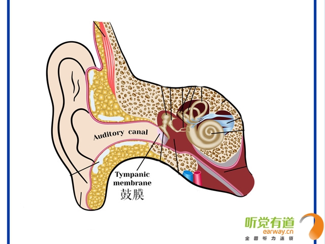 鼓膜為橢圓形半透明薄膜,呈傾斜位,其外側面向前、向下、向外,與外耳道底成45°~50°角。鼓膜的邊緣附著于顳骨上,其中心向內微凹陷,為錘骨柄末端附著處,稱鼓膜臍。鼓膜上1/4部薄而松弛,缺乏纖維層,稱松弛部,在活體呈紅色。下部在活體呈灰白色膜狀,稱緊張不,其前下方有一三角形反光區叫光錐,系外來光線被鼓膜的凹面集中反射而成。