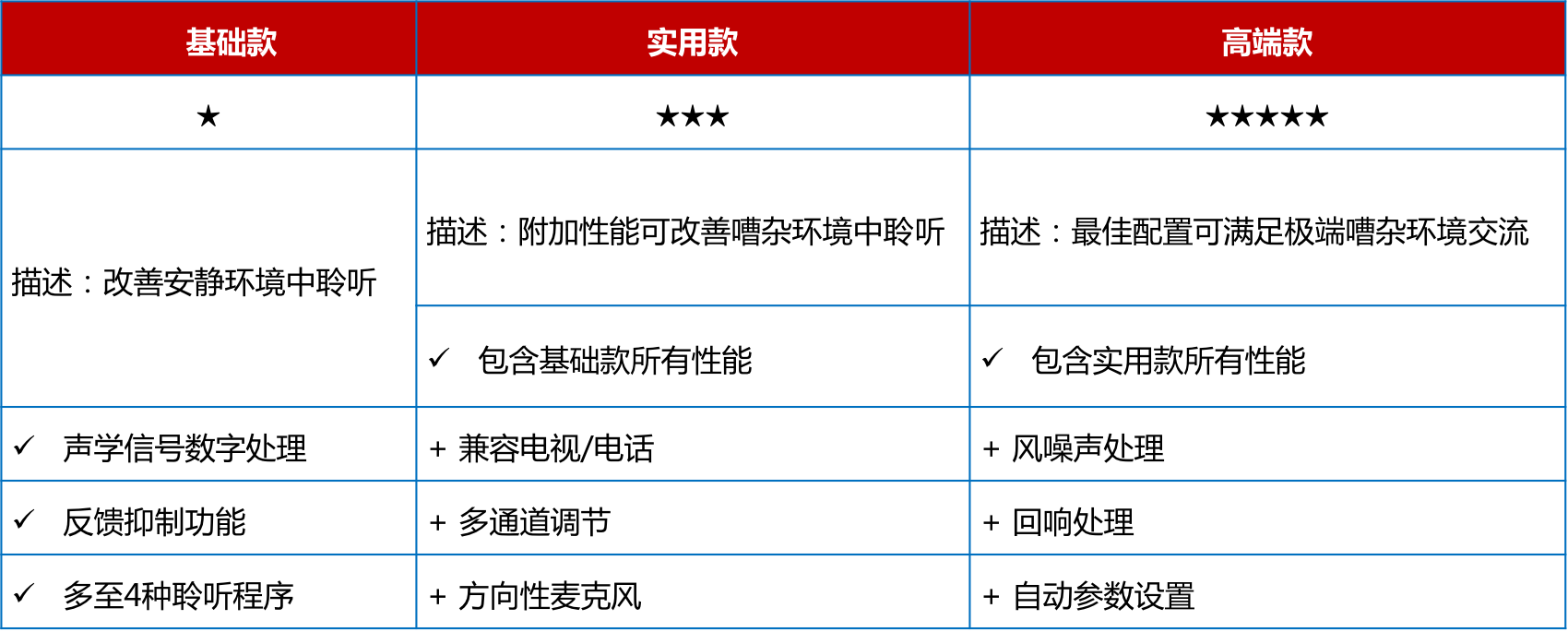 <span style="font-size:16px;"> 助聽器價格取決于機器的檔次,而檔次由內含的技術種類決定。助聽器檔次大致可分為基礎款、實用款、高端款。這三種檔次的區別請參見下表:</span></p><p style="text-align: center;"><span style="font-size:16px;"><img src="/upfiles/201808150226553383.png" width="640" alt="" /><br /></span></p><p><span style="font-size:16px;"> 那么,如何應該選擇哪種檔次的助聽器呢?</span></p><p><span style="font-size:16px;"> 選擇助聽器時主要需要考慮兩大因素。首先要考慮的就是弱聽人士的聽力損失程度,其次要考慮的就是弱聽人士的日常生活方式。比方說,某位弱聽人士是中度聽力損失,日常在家為主,那么實用款檔次助聽器通常可以滿足TA的需求。</span></p><p><span style="font-size:16px;"> 當然,這里只是為助聽器選配提供了大致方向,如何選配仍然需要具體情況具體分析,最好還是需要跟驗配師面對面溝通。</span></p><p><span style="font-size:16px;"> 1、高端款助聽器</span></p><p><span style="font-size:16px;"> 不同廠家的高端款助聽器均代表了各自的尖端技術,并致力于提供最佳的音質。</span></p><p><span style="font-size:16px;"> 這類助聽器高端之處在于自動適應各種聆聽環境,最優化佩戴者的聆聽清晰度和舒適度,讓佩戴者在極度嘈雜的環境中,如咖啡館,也能清晰地聽到同伴的言語聲。常見性能包括:</span></p><p><span style="font-size:16px;"> (1) 多種外觀、顏色可選;</span></p><p><span style="font-size:16px;"> (2) 環境自適應;</span></p><p><span style="font-size:16px;"> (3) 360°信號追蹤;</span></p><p><span style="font-size:16px;"> (4) 兼容各種藍牙設備。</span></p><p><span style="font-size:16px;"> 高端款助聽器為什么能夠自動適應各種聆聽環境呢?這是因為左右兩側的高端款助聽器能夠相互“通電報”,精準判斷所處的聆聽環境并自主學習,給出最佳的助聽設置。</span></p><p><span style="font-size:16px;"> 比如,您經常出入一家書店,每次您進入這家書店時總是習慣性地將音量調低2分貝;長此以往,當您再次進入該書店時,兩臺助聽器將會默契地降低2分貝。</span></p><p><span style="font-size:16px;"> 360°信號追蹤可以幫助佩戴者建立更佳的空間感知,對所處環境有充足的把控和預判,避免一些潛在的危險。而當助聽器連接至各種藍牙設備時,聆聽清晰度會更高,且不會打擾其他人。</span></p><p><span style="font-size:16px;"> 比如家人總是抱怨您把電視機聲音開得太大,拒絕跟您一起觀看電視時,您可以選配能夠兼容電視的助聽器,并進行獨立的音量調節,而家人只需設置為常規音量即可。高端款助聽器的價位一般在15000以上。</span></p><p style="text-align: center;"><span style="font-size:16px;"><img src="/upfiles/201808150228328500.jpg" alt="" /><br /></span></p><p><span style="font-size:16px;"> 2、實用款助聽器</span></p><p><span style="font-size:16px;"> 實用款助聽器的價格一般在8000~15000之間。實用款助聽器包含一定的降噪技術和言語提升功能,可以滿足大多數環境中的聆聽需求。部分廠家的實用款助聽器也可兼容各種藍牙設備。實用款助聽器的突出性能大致包括:</span></p><p><span style="font-size:16px;"> (1) 可連接外接音源;</span></p><p><span style="font-size:16px;"> (2) 言語清晰度提升;</span></p><p><span style="font-size:16px;"> (3) 方向性功能。</span></p><p><span style="font-size:16px;"> 3、基礎款助聽器</span></p><p><span style="font-size:16px;"> 基礎款助聽器的價位一般在8000以下。基礎款助聽器能夠滿足安靜環境中的交流需求,并具備反饋管理功能。反饋管理功能能夠有效提升佩戴舒適度,避免在日常佩戴過程中出現尖銳的干擾聲。</span></p><p><span style="font-size:16px;"> 基礎款助聽器適用于經常在家的弱聽人士,若是生活方式比較豐富多彩的弱聽人士建議選配其他檔次的助聽器。實用款助聽器的突出性能大致包括:</span></p><p><span style="font-size:16px;"> (1) 數字信號處理技術;</span></p><p><span style="font-size:16px;"> (2) 反饋管理功能;</span></p><p><span style="font-size:16px;"> (3) 多種聆聽程序可選。</span></p><p><span style="font-size:16px;"> 更多詳情請登錄m.xhfkj.cn。</span></p>" />