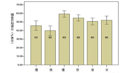 在輸入聲級為50和65 dB SPL時,快反應壓縮線路的受試者得分明顯比慢反應壓縮線路的受試者差;在80 dB SPL輸入聲級下則并無明顯差別。