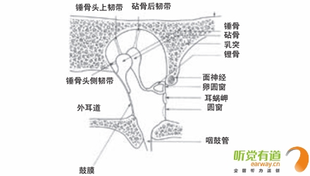 <span style="font-size:16px;"> 中耳結構包括鼓室、咽鼓管、鼓竇和乳突腔四部分。鼓室內有聽骨、肌肉、韌帶和神經。中耳是換能器,換能是將一種能量形式轉換成另一種能量形式,中耳通過鼓膜和聽骨鏈將聲能轉換為機械能,再由鐙骨底板將機械能轉換為內耳的液態能。</span></p><p><span style="font-size:16px;"> 鼓膜是中耳和外耳的分界,呈橢圓形,中間稍向內凹陷,色灰白,較透明,與耳道底約呈30°角。鼓膜寬約8mm,高約9mm,厚0.1mm,質地韌,其構造分三層:外層是皮膚層,中層由淺層的放射狀和深層的環狀纖維組成,它們使得鼓膜能承受一定的氣壓和水壓并抗感染,內層為粘膜層,與鼓室粘膜相連續。聲音的振動,即聲能,通過耳郭和耳道共振的加強,引起鼓膜隨之振動,鼓膜與中耳的錘骨相連,在正常耳,錘骨懸掛在自鼓膜頂端至下2/3處。錘骨柄的尖端將鼓膜頂向中耳,形成錐形鼓膜的頂,稱作臍。自臍向前下達鼓膜邊緣有一個三角形的反光區,名光錐,是外來光線被鼓膜的凹面集中反射而成。鼓膜下4/5為緊張部,上1/5由于缺乏纖維層而較松馳,稱為松弛部。鼓膜可分為前上、前下、后上、后下四個象限。兒童的鼓膜薄而有彈性,年齡越大,鼓膜越厚且越僵硬。鼓環將鼓膜固定在某一位置,使其成為在外耳和中耳之間的一層防水防氣的屏障。</span></p><center><span style="font-size:16px;"><img alt="" src="/upfiles/201810080137189845.png" width="440" height="250" /></span></center><p></p><p><span style="font-size:16px;"> 中耳鼓室</span></p><center><span style="font-size:16px;"><img alt="" src="/upfiles/201810080137242362.png" width="440" height="250" /></span></center><p></p><p><span style="font-size:16px;"> 正常鼓膜像(左)</span></p><p><span style="font-size:16px;"> 在中耳腔內的聽骨是人體最小的骨頭,分別叫作錘骨、砧骨和鐙骨。這些聽骨由韌帶連接并懸掛起來形成了聽骨鏈。錘骨柄附在鼓膜上,錘骨頭與砧骨頭形成錘砧關節,砧骨底與鐙骨頭形成砧鐙關節,鐙骨底板由環狀韌帶固定在卵圓窗上。聽骨鏈利用杠桿原理使來自鼓膜的機械能放大,傳遞到卵圓窗。</span></p><center><span style="font-size:16px;"><img alt="" src="/upfiles/201810080137303051.png" width="440" height="250" /></span></center><p></p><p><span style="font-size:16px;"> 聽骨鏈</span></p><p><span style="font-size:16px;"> 咽鼓管是中耳通氣引流的唯一途徑,也是中耳感染的主要途徑。它的一端開口在較高的中耳鼓室腔,另一端開口在較低的鼻咽部,通過咽鼓管在鼻咽部的開口,空氣可從外界直接進入中耳腔。咽鼓管平時處于關閉狀態,能較好的防止細菌感染,只有在咳嗽、擤鼻涕、打哈欠或吞咽時,咽鼓管才開放。當咽鼓管開放時,根據鼓膜外側的壓力情況,空氣或者從中耳流向外界,或者從外界流向中耳,使中耳壓力得以平衡。</span></p><p><span style="font-size:16px;"> 更多詳情請登錄m.xhfkj.cn</span></p>" />