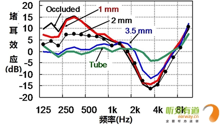 如下圖所見,當通氣孔內徑小于1mm時,其基本上不能解決佩戴者產生的堵耳效應(如圖中紅色曲線所示,1mm堵耳效應曲線幾乎與堵耳式耳模重合);當通氣孔內徑達到3.5mm時,其基本可以有效地解決佩戴者的堵耳效應(如圖中藍色曲線所示,3.5mm堵耳效應曲線與開放聲管在低頻部分基本重合)。