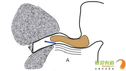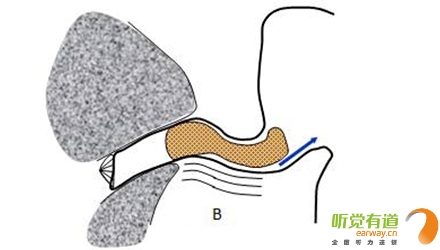 如圖B所見,B中的耳模填塞情況與A剛好相反,其在耳道口處的密封程度較差,而在耳道中段與軟骨部分的貼合程度較好,使得軟骨部振動時(說話或咀嚼食物)不會引起耳道內的空氣振動,從而有效抑制堵耳效應的發生。
