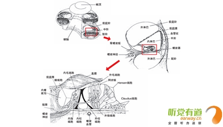 <span style="font-size:16px;"> 內耳或稱迷路,分為三個部分:半規管、前庭和耳蝸,負責聽覺的是耳蝸部分,外有骨殼,名骨迷路。耳蝸,顧名思義,像蝸牛殼一樣,耳蝸旋繞2.5~2.75圈。骨迷路的內壁被骨性螺旋板分成三部分,這三部分組成了三個錐形管腔(階),外面兩層含有淋巴液,頂部是前庭階,底部是鼓階,中間較小的三角形管腔是中階,又叫膜迷路,其中含有聽神經末梢分支。</span></p><p><span style="font-size:16px;"> </span></p><center><span style="font-size:16px;"><img alt="" src="/upfiles/20181116011946651.png" width="440" height="250" /></span></center><p></p><p><span style="font-size:16px;"> 骨迷路(右)</span></p><p><span style="font-size:16px;"> 鐙骨底板在卵圓窗里活動,振動了前庭階的外淋巴液。前庭階和鼓階在蝸孔相匯合,鼓階的另一端是圓窗,正好在卵圓窗和鐙骨底板的下方。中階被薄膜包裹,處于前庭階和鼓階之間,并與它們完全隔離。鐙骨底板在聲波的作用下,推動卵圓窗,使耳蝸內的淋巴液產生波動。顳骨很硬,淋巴液的壓力不能使之產生任何活動,因此,當鐙骨底板向里推動淋巴液時,淋巴液應有一個去處,圓窗部位就是淋巴液流動的方向。中階和前庭階有極薄的膜相隔離,而基底膜分隔中階和鼓階,基底膜是中階里螺旋器的根據地。中階的外壁由螺旋韌帶和微血管叢組成。血管叢可分泌內淋巴液,是內淋巴液化學成分的主要來源,內淋巴液是維持毛細胞功能的必要物質。基底膜上有支柱細胞、內毛細胞、外毛細胞和膠狀蓋膜等形成的螺旋器,又名Corti’s器。</span></p><p><span style="font-size:16px;"> </span></p><center><span style="font-size:16px;"><img alt="" src="/upfiles/201811160119529073.png" width="440" height="250" /></span></center><p></p><p><span style="font-size:16px;"> 耳蝸截面圖</span></p><p><span style="font-size:16px;"> 毛細胞是聽覺細胞,3500個內毛細胞和12000個外毛細胞很有序的排列著。普遍認為是外毛細胞比內毛細胞敏感35dB,因此更容易被大聲和耳毒藥物損害。蓋膜是一種膠狀物質,內側附在支持細胞上,其余部分覆蓋著毛細胞。毛細胞上的纖毛叢就埋在蓋膜里。淋巴液的波動或蓋膜的運動,可影響到毛細胞。淋巴液的波動使蓋膜產生猶如鋼琴鍵般的“剪切運動”,刺激毛細胞底部的神經末梢,產生神經沖動。耳蝸底部,離卵圓窗最近處,對高頻發生響應,耳蝸頂部,即遠離卵圓窗的地方,對低頻發生響應,中頻響應介于頂和底之間。</span></p><p><span style="font-size:16px;"> 更多詳情請登錄m.xhfkj.cn</span></p>" />