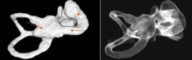 先天性內耳畸形的疾病種類繁多,診斷比較困難,隨著高分辨CT和磁共振(MRI)的應用,目前診斷率不斷提高。臨床常見的內耳畸形包括大前庭導水管綜合癥、先天性耳蝸畸形、米歇爾聽障及沙伊貝聽障。本篇將后三種畸形介紹如下:</p><p> 先天性耳蝸畸形(Congenital cochlear malformation)</p><p> 先天性耳蝸畸形又稱Mondini內耳發育不全,是最常見的一種內耳畸形。</p><p> 1、病因</p><p> 本病可為常染色體顯性或隱性遺傳病,也可為非遺傳性因素,如風疹病毒感染、過多的放射線暴露以及反應停類藥物等引起。</p><p> 2、臨床表現</p><p> 先天性耳蝸畸形包括耳蝸扁平、耳蝸發育不良,特別是第二圈和頂圈發育不良,兩者合并為一個腔;前庭擴大,巨大的前庭導水管以及半規管畸形、內耳道擴大等癥。在具體病例中不一定以上所有的畸形同時出現,可僅出現其中一種或幾種畸形。</p><p> 3、聽力學表現</p><p> 出生即無聽力,或1~2歲時才出現聽力減退,主要為感音神經性聽障,部分可為混合性聽障,有部分患者可長期保存殘余聽力。個別患者可有眩暈發作。</p><p> 4、診斷</p><p> 主要根據聽力學表現和影像學檢查。通過高分辨CT可看到耳蝸畸形。內耳MRI顯示膜迷路內水充盈,耳蝸扁平,耳蝸第二圈與頂圈間隔缺損,以及半規管、前庭的畸形。</p><p> </p><center><img alt="" src="/upfiles/201903250158493159.png" width="640" height="200" /></center><p></p><p> 先天性耳蝸畸形伴前庭和外半規管發育不良</p><p> 5、治療</p><p> 目前尚無有效的治療方法。如有殘余聽力,可佩帶助聽器后進行語言康復。無殘余聽力或極重度聽障患者可考慮人工耳蝸植入。</p><p> 米歇爾聽障(Michel’s deafness)</p><p> 屬常染色體顯性遺傳,是最嚴重的內耳畸形,內耳可完全未發育,可伴有其它器官的畸形和智力障礙。</p><p> 1、診斷</p><p> 主要依靠顳骨高分辨CT和內耳MRI。</p><p> </p><center><img alt="" src="/upfiles/201903250158577271.png" width="640" height="160" /></center><p></p><p> 雙側內耳畸形:左側無內耳迷路及內耳道機構,為米歇爾畸形;右側空耳蝸及前庭擴大,為先天性耳蝸畸形</p><p> 2、治療</p><p> 目前無特殊辦法,此類病例不適合行人工耳蝸植入術,但是聽覺腦干植入術的適應癥,其效果有待進一步證實。</p><p> 沙伊貝聽障(Scheibe dysplasia)</p><p> 為常染色體隱性遺傳,是最輕的內耳畸形,畸形僅限于蝸管和球囊,故又稱耳蝸球囊型畸形。</p><p> 1、診斷</p><p> 主要根據先天性聽損和MRI檢查</p><p> 2、治療</p><p> 此病可選擇性地行人工耳蝸植入術。</p><p> 更多詳情請登錄聽覺有道助聽器m.xhfkj.cn</p>" />