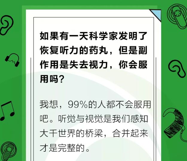 2019年3月29日聽覺有道推出一個全新的欄目內容<br /> 一本正經地奇思妙想<br /></span><p><span style="font-size:16px;"> 內容全靠一張圖:</span></p><p style="text-align: center;"><span style="font-size:16px;"><img src="/upfiles/201903290834583126.jpg" alt="" /><br /></span></p><span style="font-size:16px;"> 言語雖然不多僅僅三兩句<br /> 大家隨便看看就行了<br /> 可我們一定得往心里去啊<br /> 嚴肅點:愛耳君估計,99%的人心里都在想,誰會那么傻會做“拆東墻補西墻”的事情呢。<br /> 在現實中,很多恢復聽力藥物的研究就尚處于這個階段,我們在新聞上看到科學家已經可以讓小老鼠通過注射藥物等方式恢復聽力,然而我們沒有看到的是,這類方式目前還不能控制其極大的副作用,這種副作用可不僅僅是失明那么簡單,有可能還會丟掉性命。<a href="http://m.xhfkj.cn/listDetail.aspx?id=102818" target="_blank"><strong><span style="color:#3333ff;">五個不容易被察覺的耳部疾病</span></strong></a><br /></span><p><span style="font-size:16px;"> 誠然,科研的每一分進步都難得可貴,未來會是怎樣的,愛耳君不知道。愛耳君希望有朝一日科學家能真正發明出一款“沒有副作用”的藥丸,讓全天下聽障人士都能恢復聽力。但我們也需正視現實把握當下,早發現、早干預、早治療。</span></p><span style="font-size:16px;"> 相關推薦閱讀:<a href="http://m.xhfkj.cn/listDetail.aspx?id=102841" target="_blank"><strong><span style="color:#3333ff;">如何正確應對聽力損失?聽力保健的8大誤區</span></strong></a><br /><br /><br /> 聽覺有道助聽器價格:http://m.xhfkj.cn/products.html<br /><br /> 發布于2019年3月29日 星期五<br /><br /> 上午8:36分</span>" />