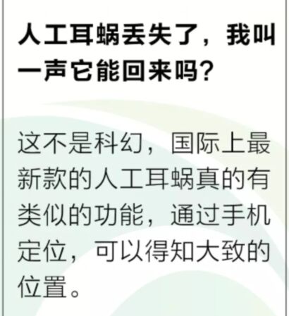 2019年4月10日這是一個新型的欄目<br /> 一本正經(jīng)地奇思妙想<br /> 內(nèi)容全靠一張圖<br /> 言語僅僅三兩句<br /> 大家隨便看看就行了<br /> 可一定得往心里去啊<br /><br /></span><div style="text-align: center;"><img src="/upfiles/20190410093258759.jpg" alt="" /></div> 嚴肅點:幾乎每個月,都有人工耳蝸丟失的事件發(fā)生,每一次都會成為該地方新聞的焦點。<br /> 無論我們多么小心,不經(jīng)意間的疏忽總會造成大麻煩。對于遺失耳蝸的家庭來說,一方面要承擔一筆不少的購機費用,另一方面會有一段時間的“聽力真空期”,我們不禁感嘆,要是耳蝸能自己報告位置就好了。<br /> 實際上這并非空想,國際某品牌人工耳蝸的最新設(shè)備已經(jīng)可以實現(xiàn)遺失位置定位,通過手機,我們可以找到處理器所在的大致位置(如果你有興趣,可以留言交流)。<br /> 5G時代,萬物互聯(lián),遺失定位也是未來人工耳蝸產(chǎn)品設(shè)計的趨勢之一,未來小伙伴們就可以體驗這種技術(shù)啦。<br /> 相關(guān)推薦閱讀:<a href="http://m.xhfkj.cn/listDetail.aspx?id=102609" target="_blank"><strong><span style="color:#3333ff;">保如果世界上沒有聽力設(shè)備:助聽器和耳蝸。</span></strong></a><br /><br /><br /> 聽覺有道助聽器價格:http://m.xhfkj.cn/products.html<br /><br /><br /> 發(fā)布于2019年4月10日 星期三<br /> 上午9:33分" />