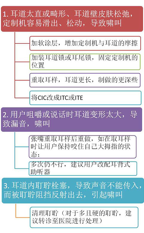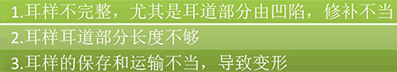 助聽器的嘯叫一直是困擾用戶和驗配師的主要問題之一,其中定制機的嘯叫問題尤其突出。</p><p> 定制機是根據病人的聽力狀況和耳道形狀定制的,每一臺的制作都是獨一無二的,因此出現嘯叫的原因也比標準制作過程的耳背式助聽器復雜得多,有些定制機甚至多次重做仍然不能排除嘯叫。</p><p> 但無論如何只要我們客觀、理智地對待嘯叫問題,找出癥結之所在,對癥下藥,那么減少甚至避免嘯叫的也并非難事。</p><p> 什么是嘯叫?</p><p> 所謂嘯叫就是助聽器發出刺耳的連續尖叫聲,術語上我們稱之為聲反饋,它可能是聲音反饋或電路上的正反饋。</p><p> </p><center><img alt="" src="/upfiles/201905070200484006.png" width="440" height="250" /></center><p></p><p> 內部嘯叫和外部嘯叫</p><p> 嘯叫分內部嘯叫和外部嘯叫兩種。外部嘯叫主要是定制機外殼或耳背機耳模與耳道不密封引起的,而其它原因引起的嘯叫可稱為內部嘯叫。</p><p> </p><center><img alt="" src="/upfiles/201905070200528641.png" width="440" height="250" /></center><p></p><p> 區分內部嘯叫和外部嘯叫</p><p> 區分內部和外部嘯叫時必須用聽筒,驗配師用聽筒連接到用戶反映有嘯叫的助聽器的出聲孔,可用橡皮泥密封接口和通氣孔,不使聲音泄漏出來,然后從聽筒內聽助聽器的輸出聲,若仍有嘯叫則說明助聽器有內部嘯叫,否則說明助聽器只有外部嘯叫。</p><p> 內部嘯叫的原因和排除</p><p> 內部嘯叫的主要原因有:</p><p> </p><center><img alt="" src="/upfiles/20190507020058626.png" width="440" height="250" /></center><p></p><p> 為了防止助聽器出現內部嘯叫,除了助聽器廠家對產品制作和檢驗把好關,對于驗配師和用戶來說,需要特別注意兩點:</p><p> </p><center><img alt="" src="/upfiles/201905070201041323.png" width="440" height="100" /></center><p></p><p> 外部嘯叫的原因和排除</p><p> 絕大部分用戶抱怨的定制機嘯叫是指外部嘯叫,外部嘯叫的原因和處理方法非常復雜,從定制機的整個驗配過程來看,我們可以將這些根原歸納到下面四大類:</p><p> 1.耳道</p><p> 耳道的客觀情況是產生嘯叫的主要原因,其可能引起嘯叫的原因及解決方法如下:</p><p> </p><center><img alt="" src="/upfiles/201905070201091323.png" width="482" height="780" /></center><p></p><p> 2.耳樣(印模)</p><p> 耳樣是定制機外殼制作的原型,耳樣的好壞直接影響到外殼完成后的密封性和舒適度,病人的聽力損失越重,對耳樣的要求也越高。在耳樣這一環節的如下情況將導致定制機嘯叫:</p><p> </p><center><img alt="" src="/upfiles/201905070201157387.png" width="440" height="80" /></center><p></p><p> 取耳樣是驗配師的基本功,必須在充分檢查耳道基礎上,膽大心細地取到合格的耳樣。</p><p> 3.選配和調試</p><p> </p><center><img alt="" src="/upfiles/201905070201216863.png" width="440" height="250" /></center><p></p><p> 選配最重要的就是做好外形和功率的平衡,不要為拉定單而勉強選配,如果用戶需要加大音量至幾乎滿檔才能使用,就容易出現嘯叫。</p><p> 助聽器增益設置(通過音量電位器或驗配軟件設置)的理想位置應該是在滿檔增益的二分之一到三分之二之間。</p><p> </p><center><img alt="" src="/upfiles/201905070201277561.png" width="440" height="250" /></center><p></p><p> 任何機型都有其選配范圍,如果超出此選配范圍,要讓助聽器始終在滿負荷下工作,即使沒有嘯叫,助聽器的失真、噪音等也會增加很多。</p><p> 因此選配合適的機型、線路和矩陣比重做外殼更合理、有效。</p><p> </p><center><img alt="" src="/upfiles/201905070201336863.png" width="440" height="250" /></center><p></p><p> 需要特別注意的是:價格單上的參考驗配范圍是指中高頻的值,但低頻一般會低20dB 左右,所以僅僅平均增益小于參考驗配范圍并不能保證每個頻率點都在驗配范圍內。</p><p> 加通氣孔是讓病人配戴更舒適的方法之一,但有時它也是產生嘯叫的禍首,此時減小甚至于堵塞通氣孔往往能立竿見影。堵塞氣孔可以用棉花或印模膏。</p><p> 對于一些中高檔機型帶反饋抑制功能的線路,可以設置反饋抑制的力度更大,一些輕微的嘯叫就能立刻消除。</p><p> </p><center><img alt="" src="/upfiles/201905070201384912.png" width="440" height="120" /></center><p></p><p> 4.制作</p><p> 關于定制機制作中避免外部嘯叫主要是助聽器廠家工程師需要嚴格把關,如果僅僅是定制機和耳道有輕微的不密封,可以加涂光亮漆或軟涂層處理,現場的維修中心技術員可以提供這一快速服務。</p><p> 需要重做時,必須由經驗豐富的制作人員綜合驗配師提供的信息和上次制作的記錄作出針對性措施。例如增加膨脹系數、加厚密封圈、加深耳道、調整出聲孔方向等。</p><p> 總之,定制機產生嘯叫的原因是多種多樣的,從取耳樣、選線路與矩陣直至制作,最后到調試和配戴,每一個環節處理不好都有可能產生嘯叫,只有抓好每個細節,才能最大可能地滿足病人,提高選配的成功率。</p><p> 更多詳情請登錄聽覺有道助聽器m.xhfkj.cn</p>" />