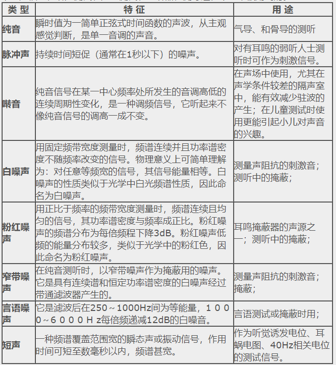1. 描述聲波的常見物理量</p><p> 1)頻率:單位時間內物體振動的次數(次/秒),用Hz表示;</p><p> 2)強度和振幅:振幅是描述物體振動時傳遞能量的大小,單位是分貝dB;</p><p> 3)分貝:人耳的聽聲范圍太大,引起聽閾的最小聲強與引起痛覺的最小聲強相差近100萬倍,不易計數,因此以某一絕對聲強為基準(20μPa),將聲強的絕對值轉換為與該基準聲強的比值(聲強的級),再取以10為底的對數,最終計數單位變成了貝爾(Bell),為了更細的分級,現在普遍采用1/10B,即分貝(dB)為計數單位。</p><p> </p><center><img alt="" src="/upfiles/201906100126248309.png" width="423" height="154" /></center><p></p><p style="text-align: center;">音波示意圖</p><p style="text-align: left;"> 4)相位:指聲源相對于聽者的方向或位置,當頻率相同的聲音同時到達某點時,如果相位相同,其結果是使聲音顯得更響;當聲音一前一后分別到達時,相位出現部分抵消,其結果是使聲音顯得更輕,相位是確定聲源位置的依據;</p><p> 5)聲壓級(SPL):是用對數級的辦法來表示聲壓的相對大小,單位是dB SPL。計算公式為Lp(SPL)=20lg(P/P0),P0為基準聲壓,在空氣中取人耳1000Hz處能聽到的最小聲壓20μPa。</p><p> 2. 聽力學中常用的聲音信號</p><p> 下列聲信號在聽力測試、聲場測試、助聽器檢測等過程中經常被用到的。</p><p> </p><center><img alt="" src="/upfiles/201906100126317113.png" width="554" height="600" /></center><p></p><p> 更多詳情請登錄聽覺有道助聽器m.xhfkj.cn</p>" />