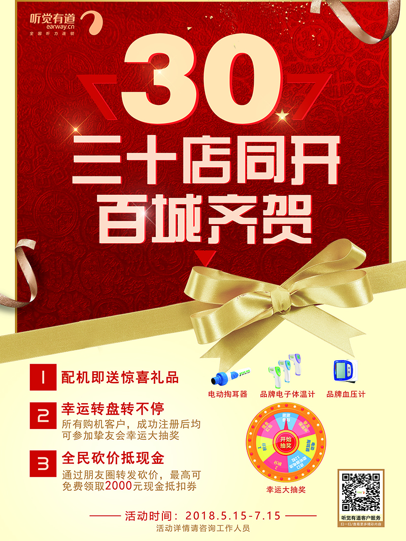 <span style="font-size:16px;"><img src="/upfiles/201805140533309372.jpg" alt="" /><br /></span></p><p style="text-align: center;"><span style="font-size:16px;"><br /></span></p><p><span style="font-size:16px;"> 聽覺有道助聽器驗(yàn)配中心30家門店于5月15日正式開業(yè),百城同慶!</span></p><p><span style="font-size:16px;"> 聽覺有道是一家高端、專業(yè)的全國(guó)聽力連鎖機(jī)構(gòu),有著近30年的助聽器驗(yàn)配經(jīng)驗(yàn),是廣東聽覺有道企業(yè)管理有限公司旗下品牌。</span></p><p><span style="font-size:16px;"> 公司現(xiàn)有專家級(jí)驗(yàn)配師400多名,驗(yàn)配服務(wù)中心遍布華西、華東、華南、華北主要省市,同時(shí)與GN集團(tuán)進(jìn)行戰(zhàn)略合作,代理美國(guó)貝爾通助聽器等助聽器品牌,擁有多條產(chǎn)品線:聽力篩查聽力篩查,聽力診斷,平衡診斷,助聽器驗(yàn)配及專家級(jí)軟件(聽力診斷設(shè)備操作系統(tǒng)與患者信息服務(wù)管理系統(tǒng)),行業(yè)內(nèi)領(lǐng)先的無線藍(lán)牙助聽器通訊技術(shù),為聽障朋友提供一站式助聽器驗(yàn)配解決方案!</span></p><p><span style="font-size:16px;"> 作為助聽器驗(yàn)配行業(yè)的專業(yè)服務(wù)者,專業(yè)的驗(yàn)配環(huán)境,專家級(jí)的驗(yàn)配師,將時(shí)刻秉承專業(yè)全面的服務(wù)、豐富的驗(yàn)配經(jīng)驗(yàn)及先進(jìn)的驗(yàn)配設(shè)備,同時(shí)為聽障朋友提供康復(fù)指導(dǎo)及助聽器售后服務(wù),讓聽障朋友更好更放心地傾聽!</span></p><p style="text-align: center;"><span style="font-size:16px;"> <strong>我們的新門店地址(30家):</strong></span></p><p><span style="font-size:16px;"></span></p><p></p><p style="text-align: center;"><span style="font-size:16px;"> <strong>聽覺有道華南高端驗(yàn)配中心</strong></span></p><p style="text-align: center;"><span style="font-size:16px;"><strong><img src="/upfiles/201805151039587785.png" alt="" /><br /></strong></span></p><p style="text-align: center;"><span style="font-size:16px;"> 電話:020-87066099</span></p><p style="text-align: center;"><span style="font-size:16px;"> 地址:廣州市天河區(qū)體育東路122號(hào)羊城國(guó)際商貿(mào)中心西塔1108(地鐵體育中心B出口前行100米,專家坐診,只接受預(yù)約)</span></p><p style="text-align: center;"><span style="font-size:16px;"><br /></span></p><p style="text-align: center;"><span style="font-size:16px;"> <strong>聽覺有道內(nèi)蒙古呼市烏蘭察布服務(wù)中心</strong></span></p><p style="text-align: center;"><span style="font-size:16px;"><strong><img src="/upfiles/201805151040168591.png" alt="" /><br /></strong></span></p><p style="text-align: center;"><span style="font-size:16px;"> 電話:0471-3977839、13514714042</span></p><p style="text-align: center;"><span style="font-size:16px;"> 地址:內(nèi)蒙古呼和浩特市賽罕區(qū)烏蘭察布東街路北(招商考試中心旁)</span></p><p style="text-align: center;"><span style="font-size:16px;"><br /></span></p><p style="text-align: center;"><span style="font-size:16px;"> <strong>聽覺有道成都金堂服務(wù)中心</strong></span></p><p style="text-align: center;"><span style="font-size:16px;"><strong><img src="/upfiles/201805151040458276.png" width="500" alt="" /><br /></strong></span></p><p style="text-align: center;"><span style="font-size:16px;"> 電話:17780478558</span></p><p style="text-align: center;"><span style="font-size:16px;"> 地址:成都市金堂縣趙鎮(zhèn)十里大道300號(hào)(一橫道路口)</span></p><p style="text-align: center;"><span style="font-size:16px;"><br /></span></p><p style="text-align: center;"><span style="font-size:16px;"> <strong>聽覺有道四川雅安服務(wù)中心</strong></span></p><p style="text-align: center;"><span style="font-size:16px;"><strong><img src="/upfiles/201805151041171639.png" alt="" /><br /></strong></span></p><p style="text-align: center;"><span style="font-size:16px;"> 電話:17738307596</span></p><p style="text-align: center;"><span style="font-size:16px;"> 地址:雅安市雨城區(qū)大南街22號(hào)(天主教堂對(duì)面)</span></p><p style="text-align: center;"><span style="font-size:16px;"><br /></span></p><p style="text-align: center;"><span style="font-size:16px;"></span></p><p style="text-align: center;"><span style="font-size: 16px;"> <strong>聽覺有道東營(yíng)廣饒服務(wù)中心</strong></span></p><p style="text-align: center;"><span style="font-size: 16px;"><strong><img src="http://m.xhfkj.cn/upfiles/20180515104347120.png" alt="" /><br /></strong></span></p><p style="text-align: center;"><span style="font-size: 16px;"> 電話:0546-6281512</span></p><p style="text-align: center;"><span style="font-size: 16px;"> 地址:東營(yíng)市廣饒縣花苑路與兵圣路十字路口東行20米路北(醫(yī)藥公司對(duì)面)</span></p><p style="text-align: center;"><span style="font-size: 16px;"><br /></span></p><p style="text-align: center;"><span style="font-size: 16px;"> <strong>聽覺有道河南洛陽服務(wù)中心</strong></span></p><p style="text-align: center;"><span style="font-size: 16px;"><strong><img src="http://m.xhfkj.cn/upfiles/201805151044003400.png" alt="" /><br /></strong></span></p><p style="text-align: center;"><span style="font-size: 16px;"> 電話:0379-64324338、16637990858</span></p><p style="text-align: center;"><span style="font-size: 16px;"> 地址:河南省洛陽市澗西區(qū)景華路8號(hào)(潤(rùn)峰廣場(chǎng)正對(duì)面)</span></p><p style="text-align: center;"><span style="font-size: 16px;"><br /></span></p><p style="text-align: center;"><span style="font-size: 16px;"> <strong>聽覺有道山東聊城服務(wù)中心</strong></span></p><p style="text-align: center;"><span style="font-size: 16px;"><str