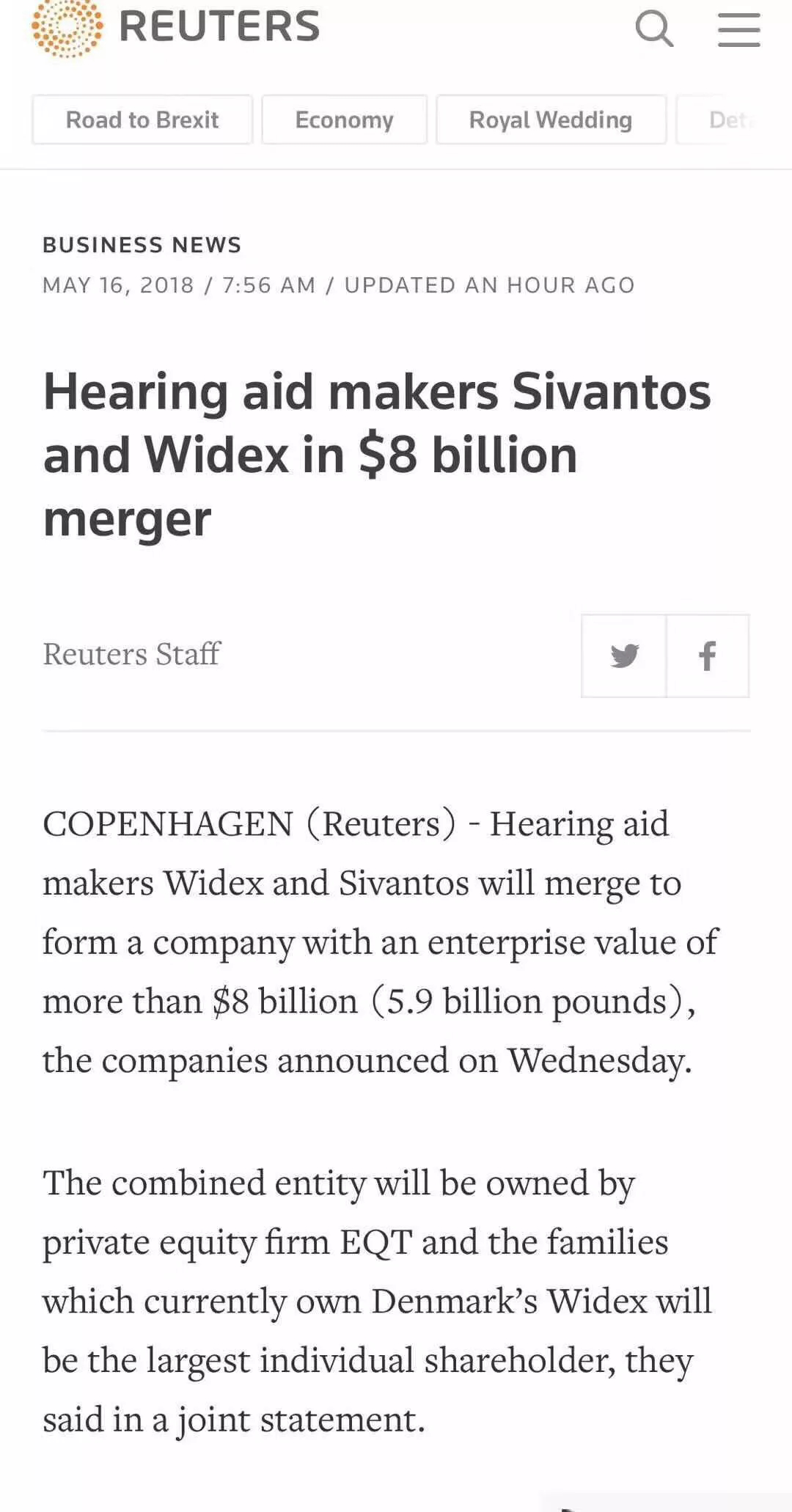 這次的合并,對助聽器廠商而言,有點“融合,碰撞,沖擊,改變”的感覺。當前的助聽器行業,規模小、利潤可觀。強強聯手,無非想成為一個“游戲改變者”,完成從游戲重要參與者到游戲大綱決定者的轉變。